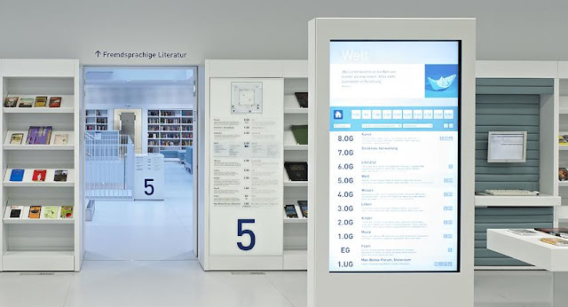 El color base de todos los elementos de decoración corresponde exactamente al tono gris claro de todas las demás superficies arquitectónicas y técnicas del edificio. Las áreas acolchadas se mantienen en el color azul CI. Un verde vivo domina el nivel de los niños. Los marcadores en el suelo son espacios de codificación para estantes. Los separadores en los estantes dan orientación y crean áreas temáticas especiales. Los cubos facilitan mucho la orientación dentro de la estantería. Las estelas de información digital están ahí para orientación e información. Los visitantes pueden encontrar diferentes tipos de medios siguiendo estas estelas. Además de eso, también insinúan las diversas actividades y eventos de la biblioteca.